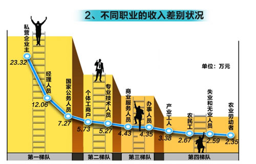 从职业类别来看,不同行业收入差距也很大。收入可以排成四个梯队(见表二),排在第一梯队的分别是私营企业主(23.32万)、经理人员(12.06万)和国家公务人员(7.27万);排在第二梯队的分别是个体工商户(5.73万)、专业技术人员(5.27万);排在第三梯队的分别是商业服务人员(4.43万)、办事人员(4.35万);排在第四梯队的则是产业工人(3.38万)、农民工(2.67万)、失业无业人员(2.59万)和农业劳动者(2.35万)。(见表2)